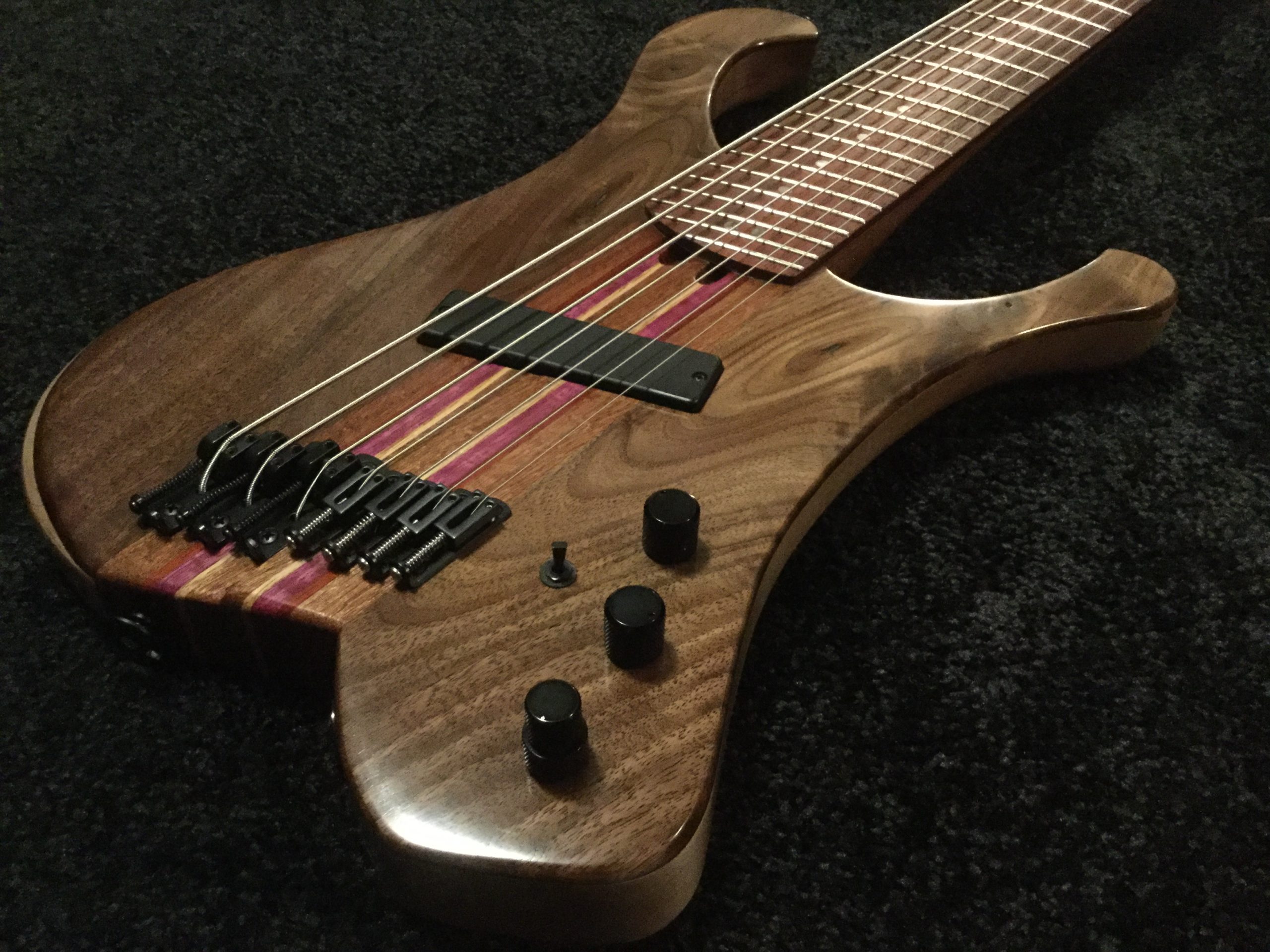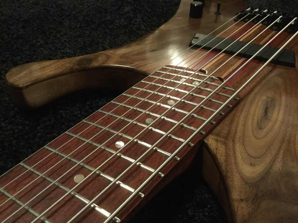 The Bassitone 7 string is a hybrid Bass/Baritone guitar, but with just the lowest four guitar strings, adding more bass strings below to satisfy the needs of us low-enders. It was designed to give the player the option to play traditional bass lines, chords, arpeggios, or all of the above comfortably and fluidly. It differs from an extended range bass in the progressive spacing of the strings. The higher four strings are spaced closer like a guitar, while the three bass strings are spaced at familiar bass string spacing. This means you can get in there plucking, slapping, picking, or whatever your preferred method is, and then you can grab a chord, strum, or keep on plucking your way up into the upper register. The 32″/30″ multi scale makes chords easy to play, and the unique body design is comfortable sitting down or standing up.